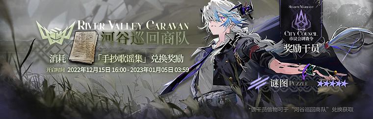 兑换说明:活动期间,玩家可通过活动关卡作战及【市议会调查令】获取「手抄歌谣集」,消耗「手抄歌谣集」来交易【河谷巡回商队】中物品