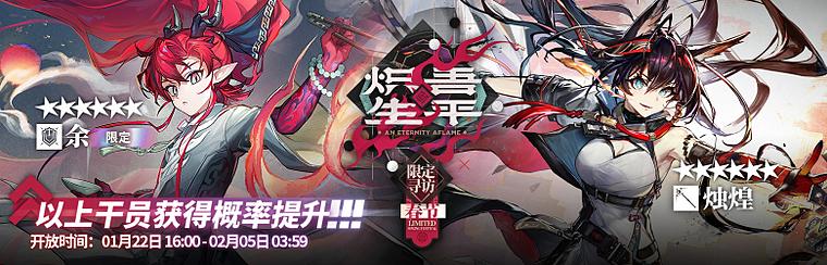 ◆新增干员【烛煌】、【寻澜】除加入【限定寻访·春节】外,将在01月30日04:00后加入并常驻【标准寻访】卡池