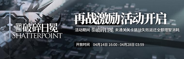 活动说明:活动期间,【破碎日冕】任意难度环境下的未通关关卡,挑战失败将返还全额理智消耗