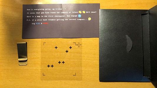 其中提到的“map”(地图)即为下方画有指南针的透明纸片。