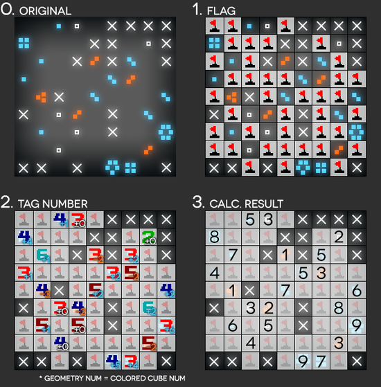 - 将图案矩阵转化为一个9×9扫雷地图,并在空白格插入红旗,此时这些插旗格即为地雷格;