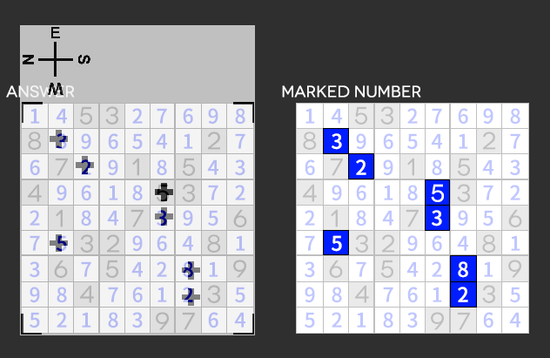- 根据“try PLUS & MINUS”,将标记的数字分别加上所在格蓝方块数/减去所在格橙方块数/不增减(空心方块),得到最终结果。